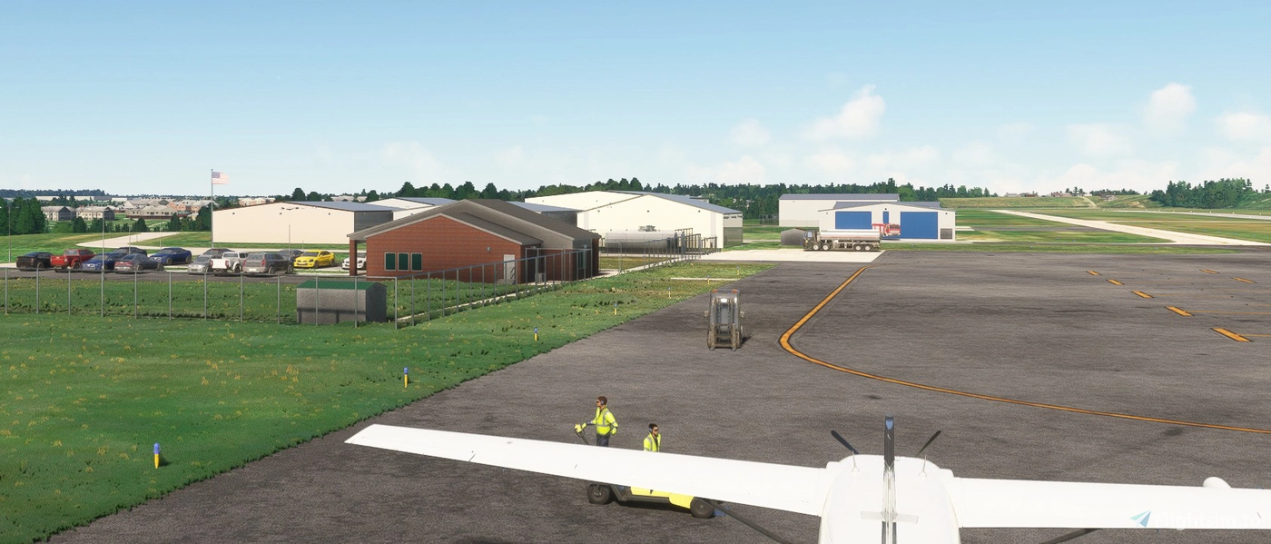 ➡️ Farmington Regional Airport (KFAM) in St. Francois County, Missouri, is another regional field recreated by danielsjam. The scenery offers a faithful depiction of the small municipal airport located just south of Farmington, with hand-modeled assets and accurate ground markings. Like KSMS, the airfield includes an open hangar with animated bi-fold doors that respond to local time or manual control via the yoke toggle. The attention to ambient detail makes KFAM an inviting stopover point for VFR cross-country flights across the Midwest.