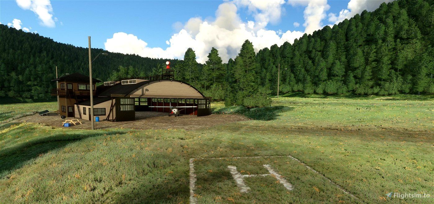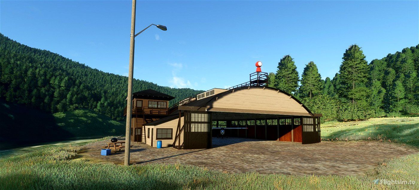 Floxtrot's field - This is a fictional version of a small field in the wilderness on the pacific coast. The hangar is situated at the Santa Maria Museum of Flight in real life. This add-on by Community creator WombiiActual comes with a custom hangar, default 3D objects, terraforming and uses objects from Mike.at's asset pack for extra flavour.