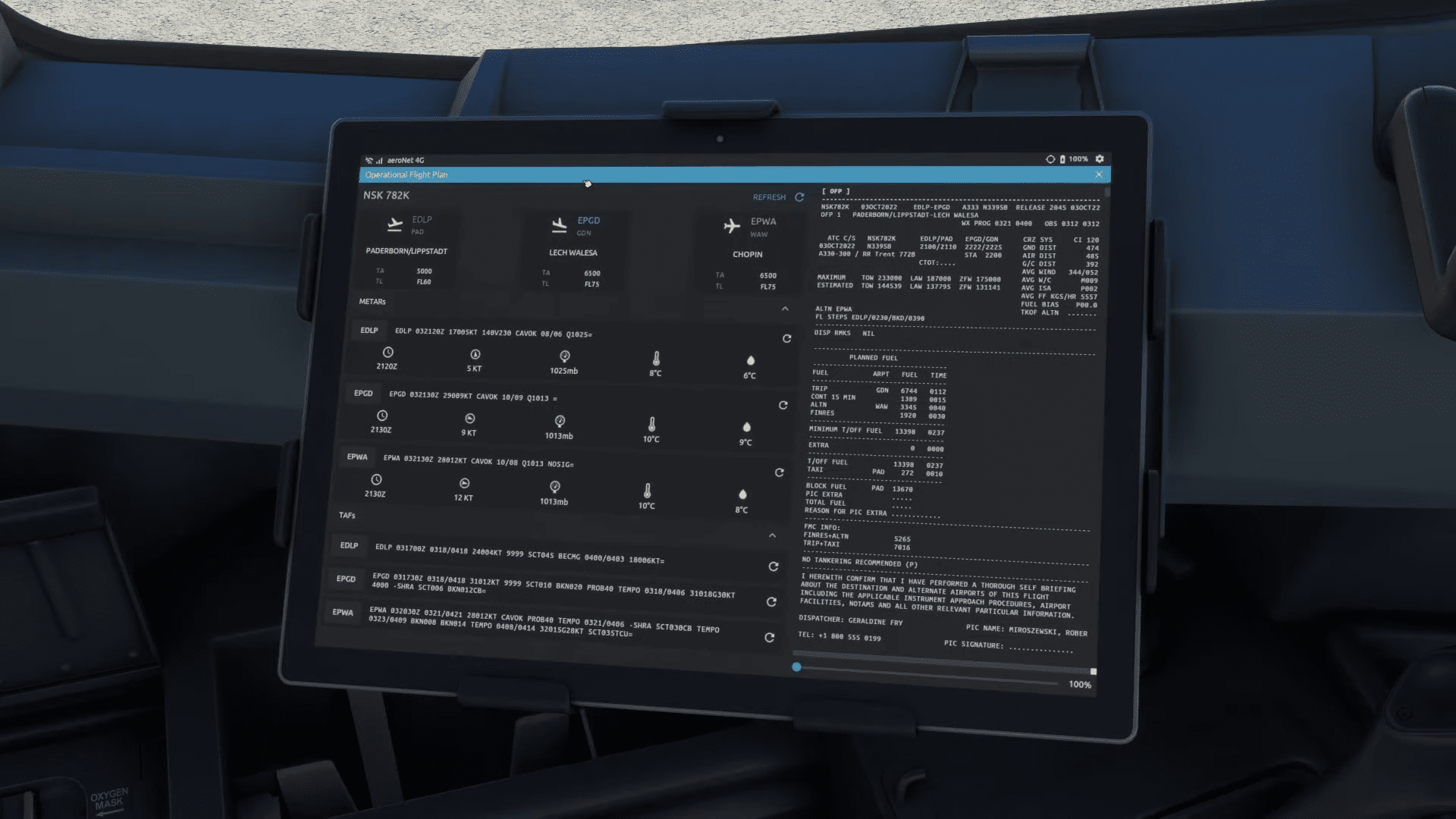 In the “Flight Info” tab the user will be able to fetch a simbrief flight plan to get all the necessary information including weather briefing and OFP. When the time will come for boarding, the user will be able to fetch weight and balance values from the simbrief briefing.
