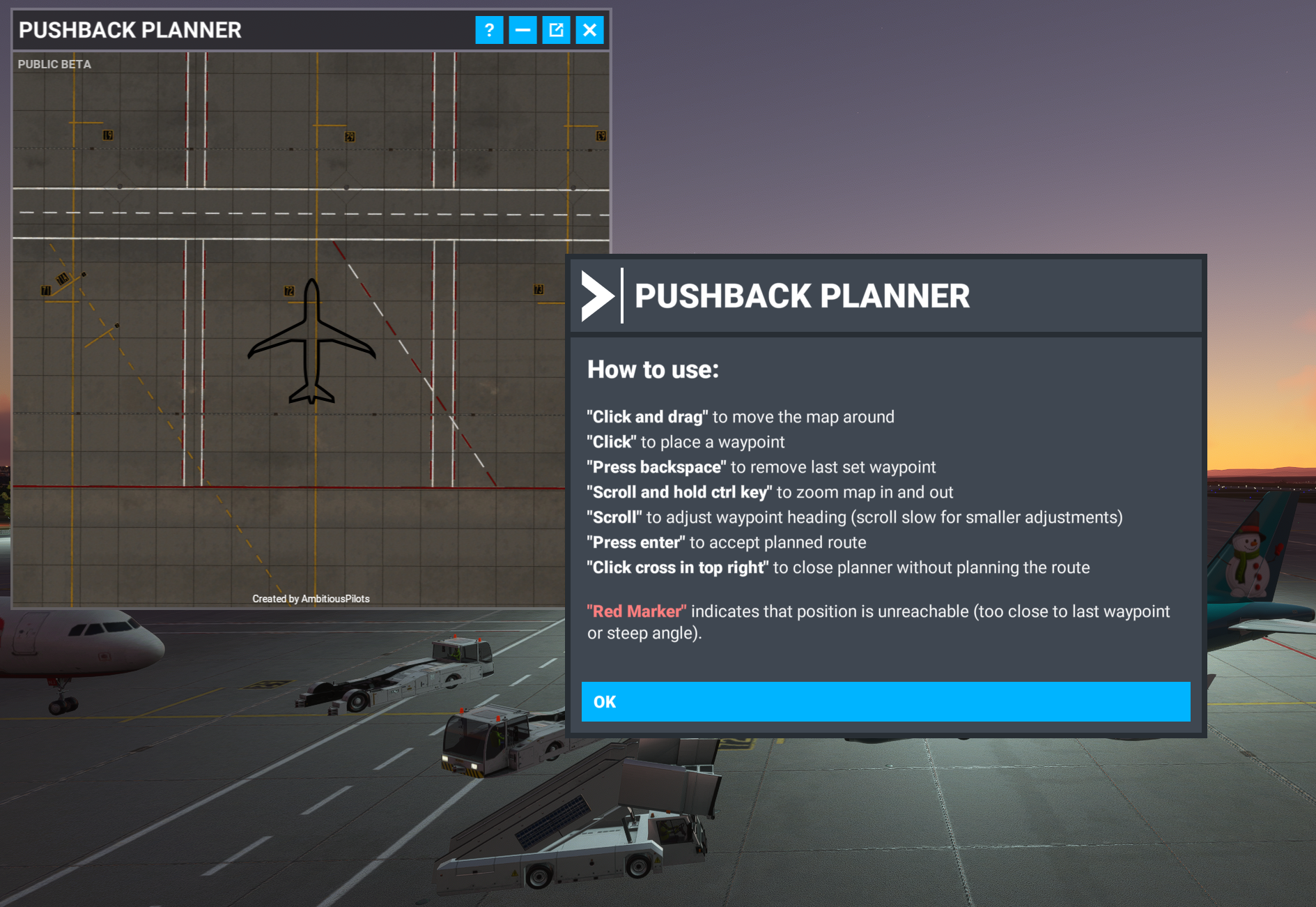 Toolbar Pushback version 1.4.0 is available now and brings the highly anticipated "Pushback Pre-Planning"! Plan the pushback route ahead and let the pushbacker automatically do his/her job whilst you carry on with your checklists and start your engine(s).