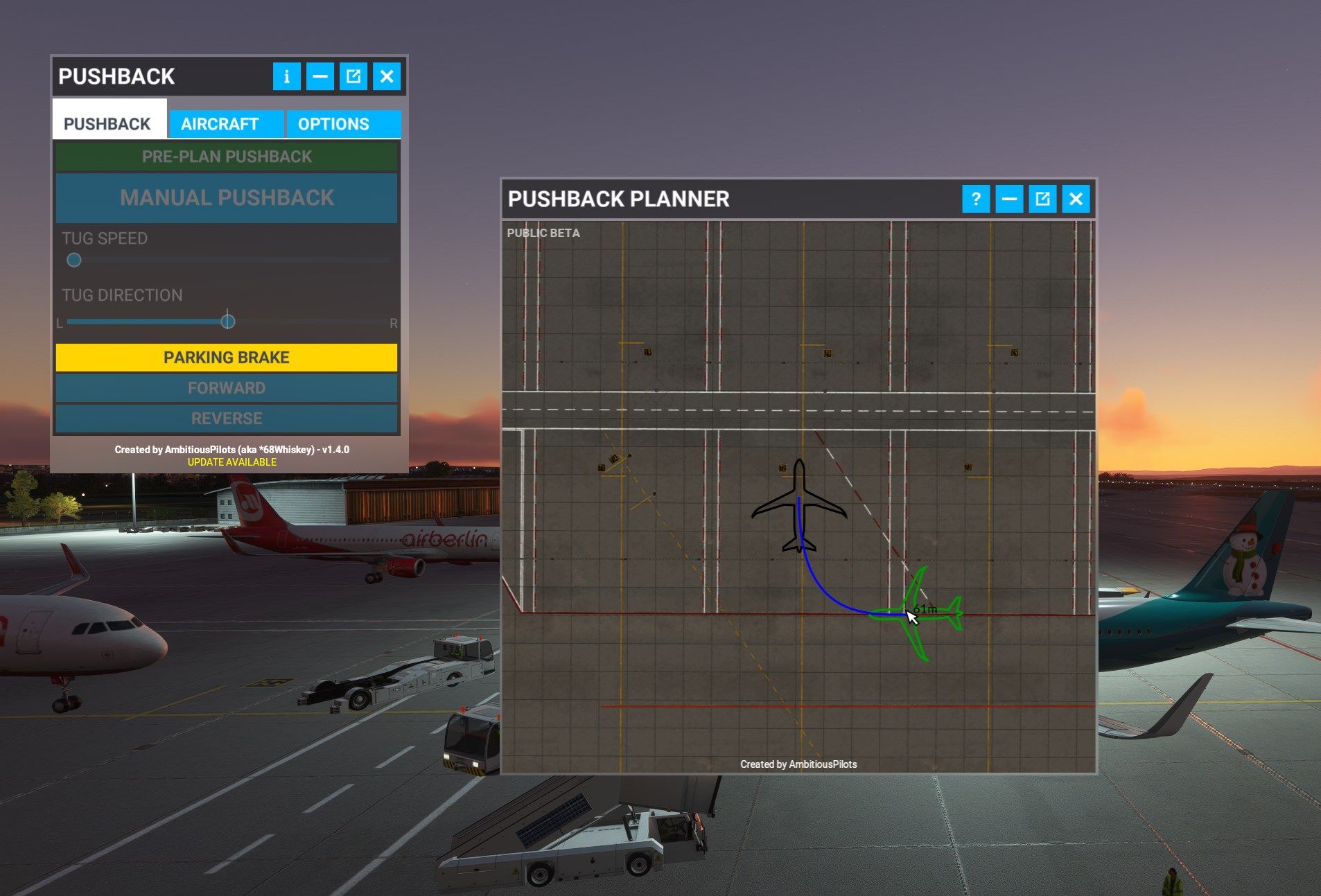 Freeware content creator AmbitiousPilots has updated their famous add-on Toolbar Pushback for Microsoft Flight Simulator to version 1.40. This update is mandatory for everyone who already owned the previous version, as Sim Update 8 required changes to this mod. With the new update - now available on Flightsim.to - a new feature called Pushback Pre-Planning has been introduced. It finally allows you to pre-plan your pushback.