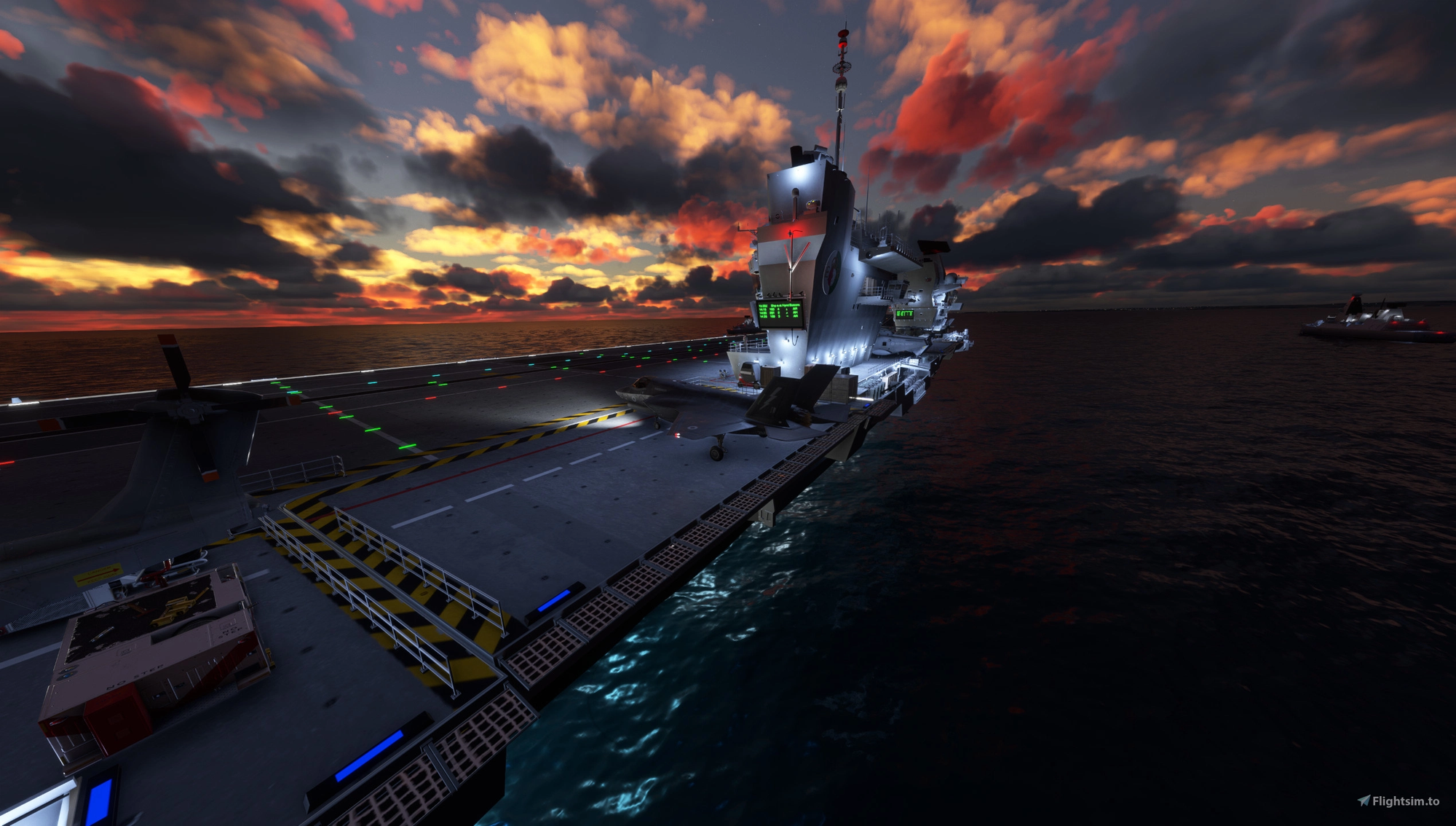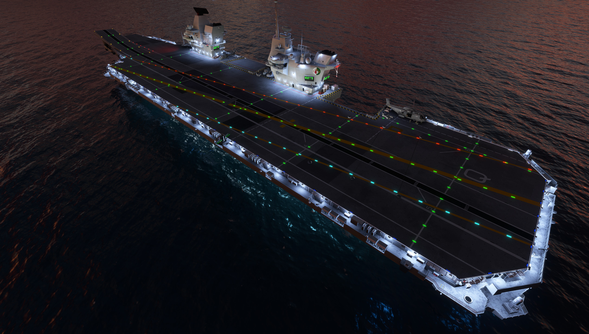 The flight deck is a living environment, with animated crew performing a range of tasks across the deck surface — though ANSMedia notes this is still a work in progress, as is the hangar, whose models and textures are not yet final. Elevators are functional, full night lighting is implemented, and a circling Merlin AEW helicopter adds atmosphere, though its Crowsnest radar fairing is yet to be modelled. The carrier is also accompanied by a battle group of escort vessels — two Type 45 Destroyers, two Type 31 Frigates, a Tide-class replenishment ship, and an Astute-class submarine — each of which offers a landable surface.