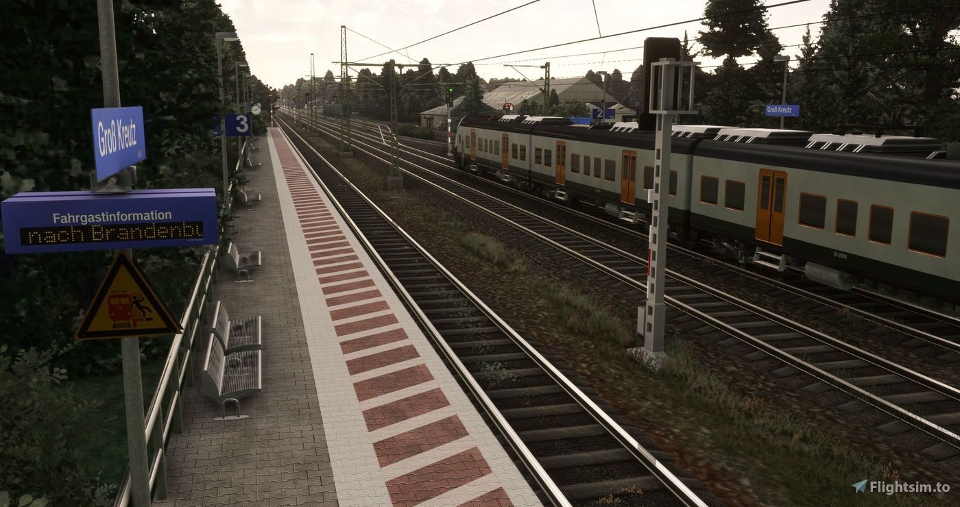 Depending on the time of day, day of the week, and season, the environment changes. Environmental elements such as ice, lawnmowers, joggers, and cyclists react to weather conditions such as temperature, rain, and snow. Acoustic details have also been included: at Groß Kreutz railway station, original station announcements can be heard, and a level crossing features animated barriers. A fully functional signal system switches from red to green as trains pass. Additionally, at Luckenwalde Hospital, an ambulance is on its way to pick up a patient.