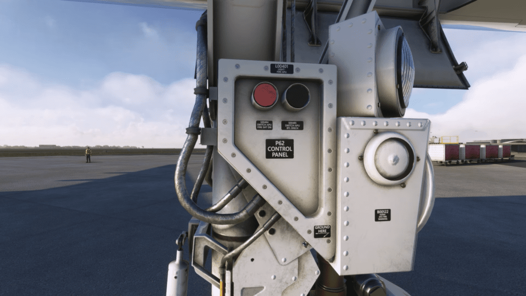 A focus on the Boeing 757’s Rolls Royce RB211 engines is then given. The fan blades and the spinner of the rendition can be also seen. The video then shifts onto the front gear section of the aircraft. Finally, Ehviator goes over the P62 Panel, a panel used by engineers to extinguish and shut down the APU if a fire breaks out.