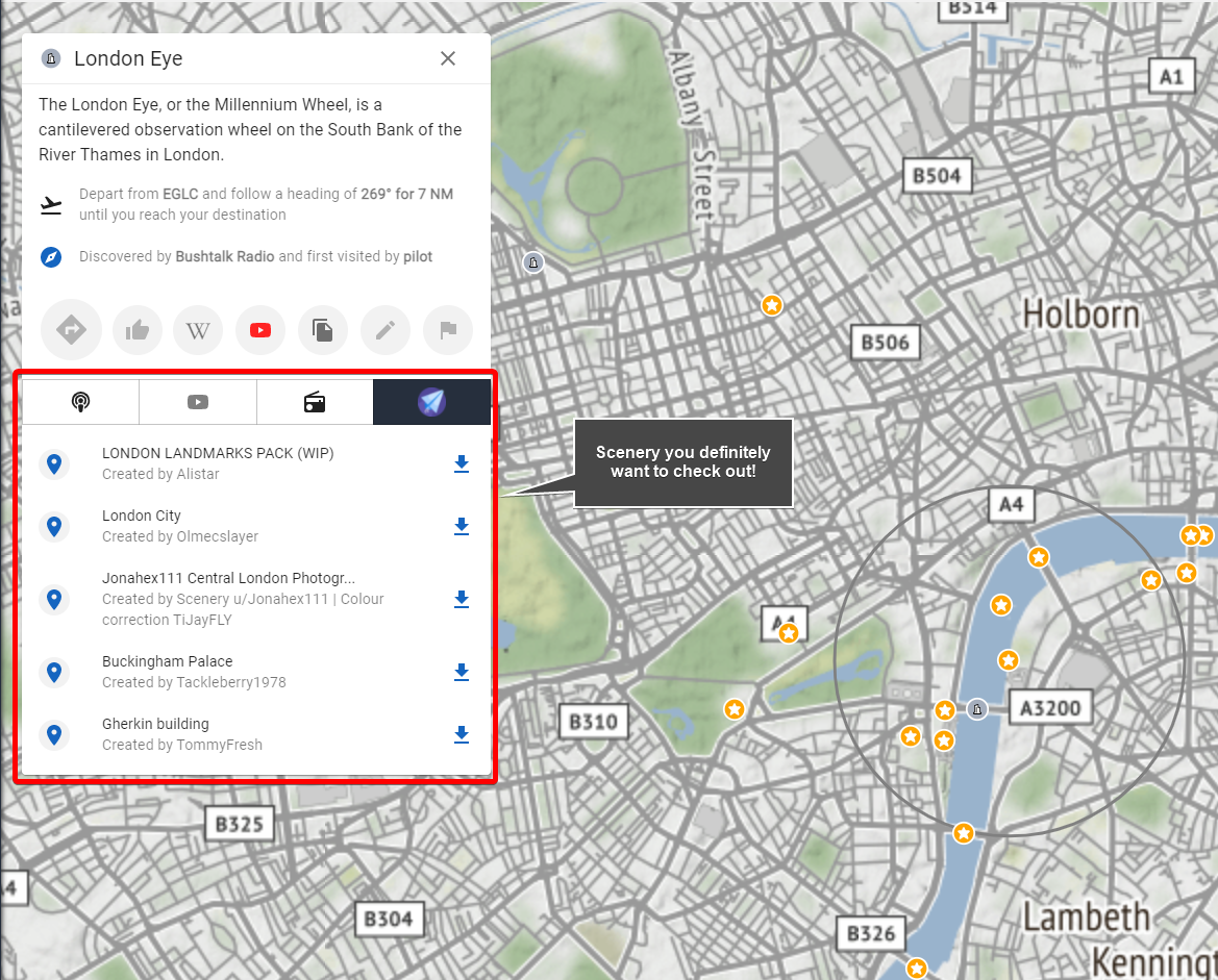 While each Point Of Interest gives you some sort of relevant information related to the place - such as a Wikipedia excerpt and links to YouTube videos, route planners and summaries - Bushtalk Radio has now implemented an additional Flightsim.to tab, highlighting scenery that is in the immediate vicinity of the POI. For this, Bushtalk Radio uses information from our own Flight Simulator Scenery Map, which already includes thousands of freeware scenery that creators have created and is updated weekly.