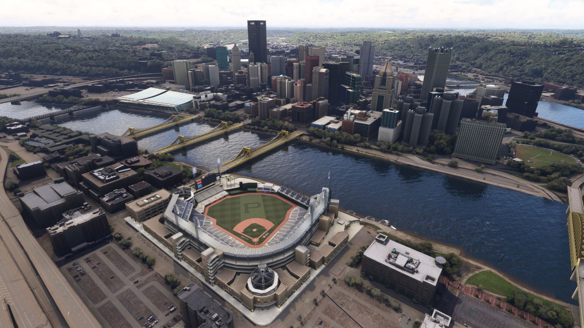 This add-on enhances the Pittsburgh area with over 120 handcrafted buildings that capture the architectural character of the downtown core and surrounding neighborhoods. In addition to the buildings, 21 detailed bridges spanning the city’s three rivers are included, adding realism to approaches into nearby airports and low-altitude VFR flights through the urban area. Key landmarks such as the PPG Paints Arena, Acrisure Stadium (formerly Heinz Field), and PNC Park are recreated in high detail. The scenery also includes an animated version of the Duquesne Incline, one of Pittsburgh’s iconic hillside funiculars.