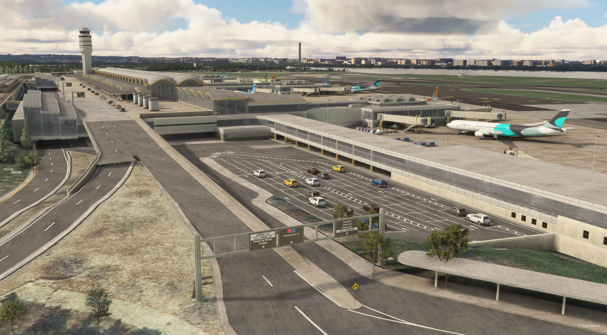 The new release includes custom-built terminal structures with physically based rendering (PBR) textures, providing a visual upgrade that reflects the architectural character of the real-world airport. The scenery also integrates satellite orthoimagery sourced from the USGS, enhancing the terrain accuracy in the airport’s vicinity. The airside environment has been comprehensively modelled with custom ground textures, including accurate decals, dirt layers, and detailed taxi markings. Jetways are custom modelled, and an animated Metro train line at the airport’s station adds an additional layer of realism. The scenery also includes modelled terminal interiors, improved apron and runway lighting, and various clutter elements placed across the apron and service areas.