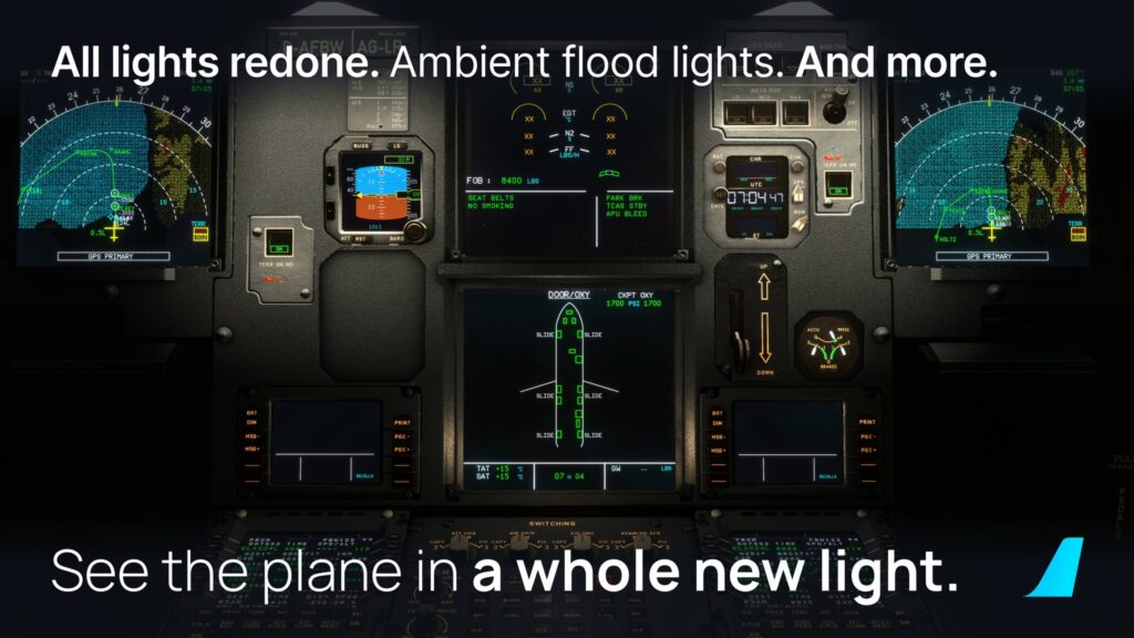 FlyByWire Simulations have announced a complete cockpit lighting system overhaul for the wonderful FlyByWire A32NX on their Facebook page. As reported by them, this overhaul includes changes to clock power behaviour, wing lights, and new glass textures. This new lighting system should provide more authenticity to the virtual cockpit, with proper reflections and enhanced ambient lighting, making night operations in the A32NX even more immersive. This lighting system overhaul is currently available in the Development and Experimental versions of the A32NX download.