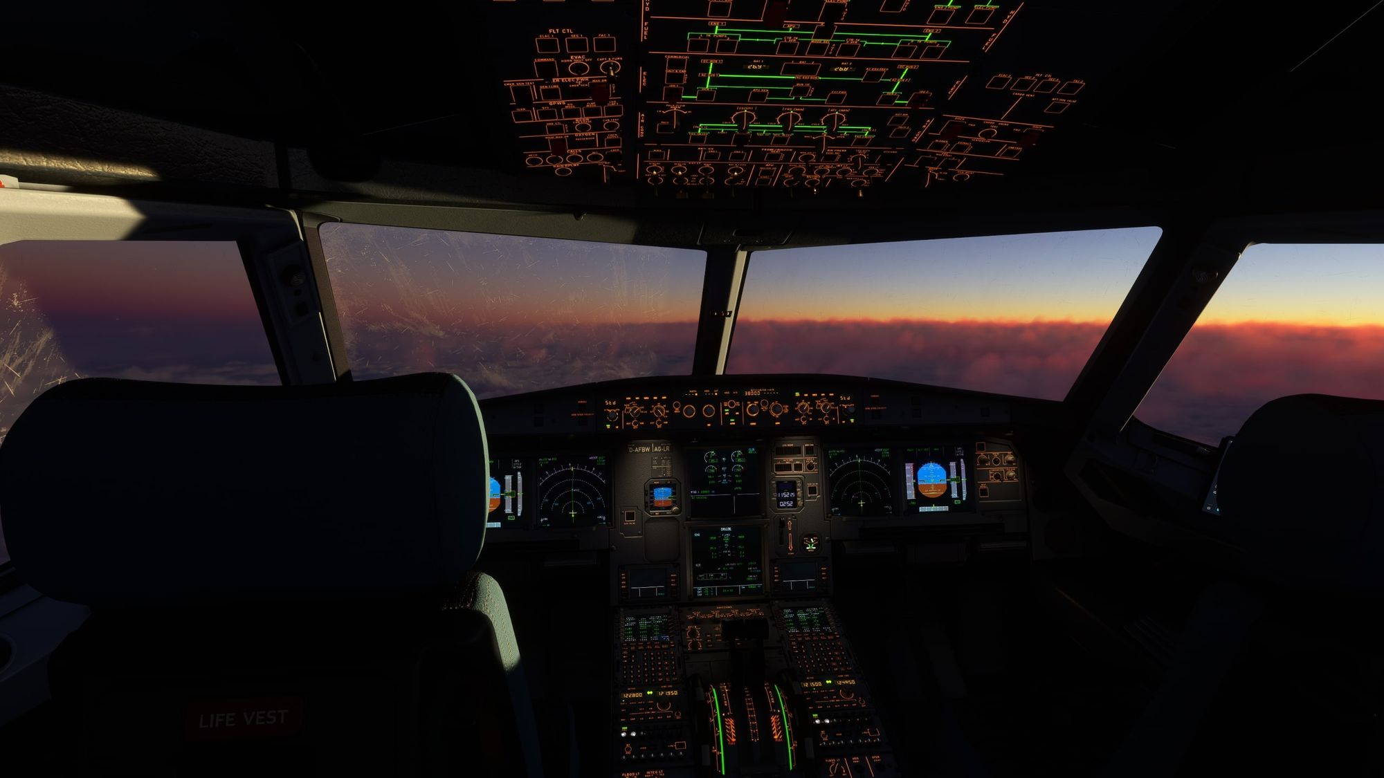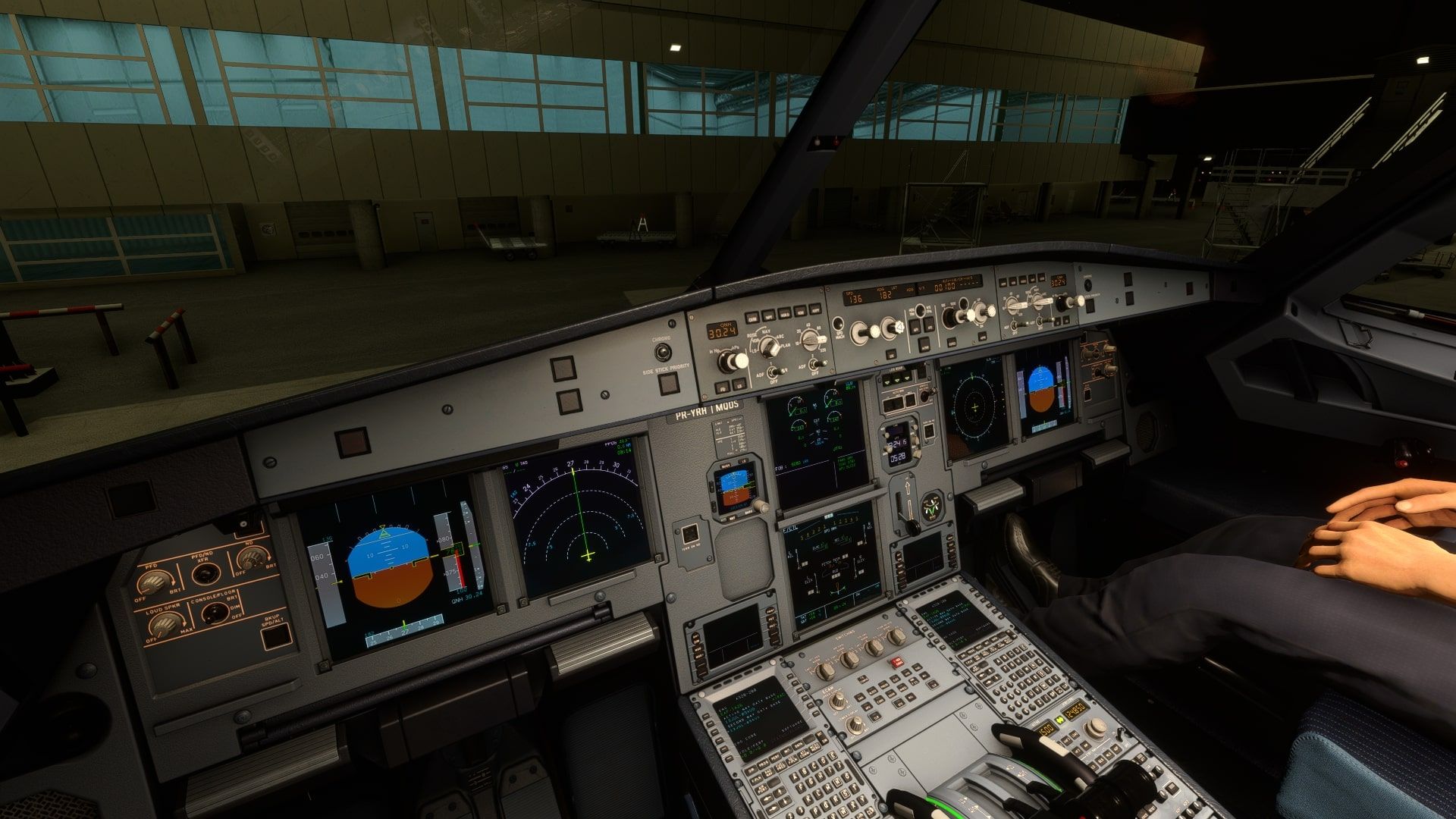 These images have been provided by SCTR311, Capt Wozza and Plasma2045 on the FlyByWire Discord Server. The update further includes various improvements to the aircraft software. Key enhancements involve a new view for the First Officer (F/O) and adjustments to the Captain's view to align with the new flyPad orientation. In the overhead section, the LEDs for the fire buttons have been separated according to power supply, and the “NO SMOKING” selection now displays a “NO PED Label”. Additionally, the update introduces warnings for retracted landing gears, including a red arrow on the panel.