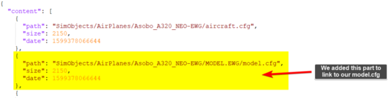 In your livery’s layout.json file, add the following contents right below the entry for the already existing aircraft.cfg and link the path to your model.cfg created inside the model folder. Remember to replace LIVERY with you liverys name and adjust the folder names in general. So here is for example, how the beginning of your layout.json file for the Eurowings livery would look like.