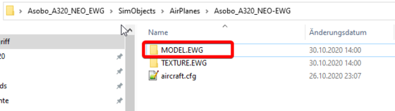 Besides your already existing TEXTURE.LIVERY folder, where your DDS textures are located in, we will create a MODEL.LIVERY folder. So if your texture is called TEXTURE.EWG like above – for Eurowings -, we will need to add a MODEL.EWG folder. Right-Click and create a new folder, name it “MODEL.LIVERY“, remember to rename it accordingly to your livery.