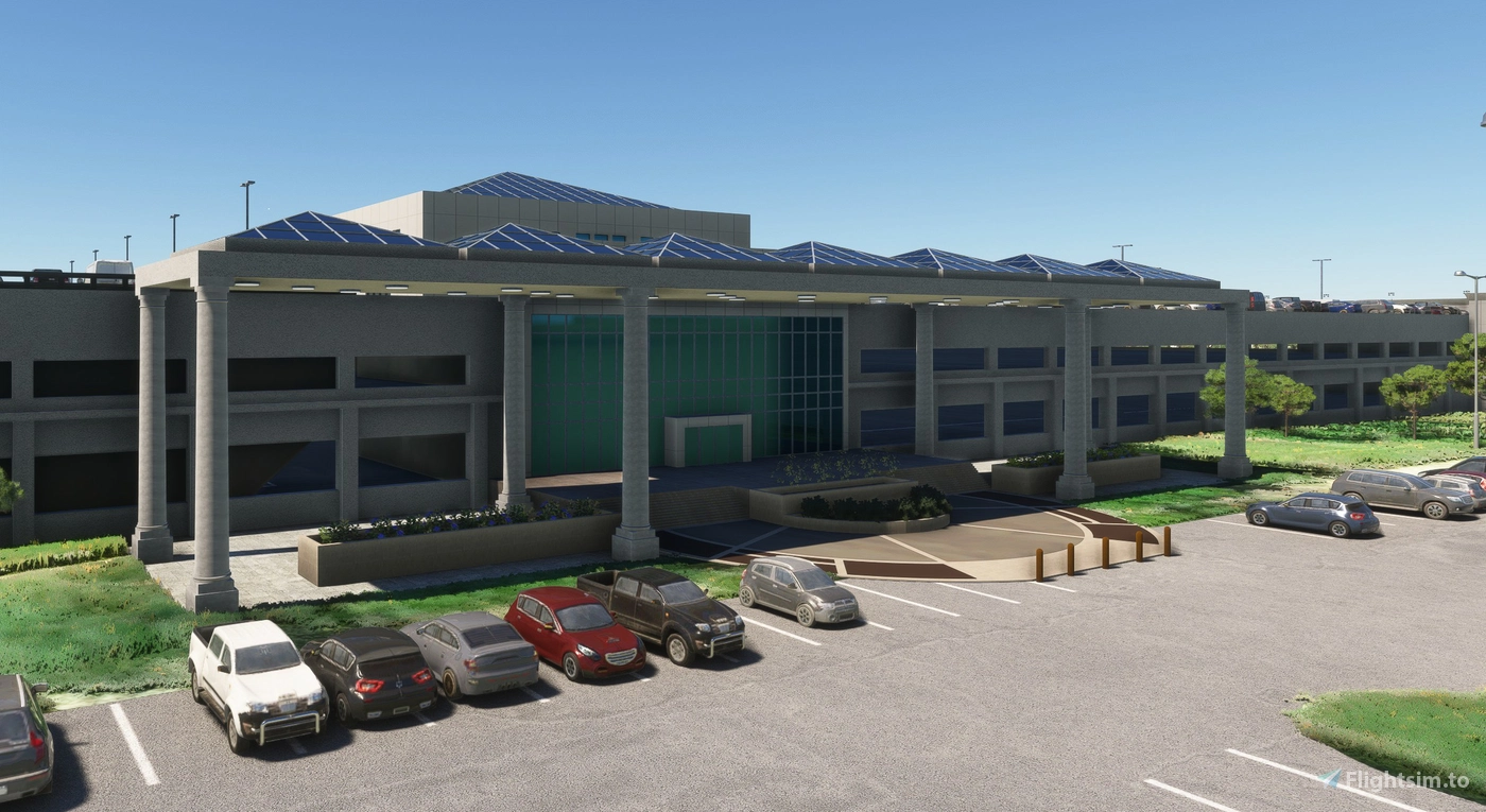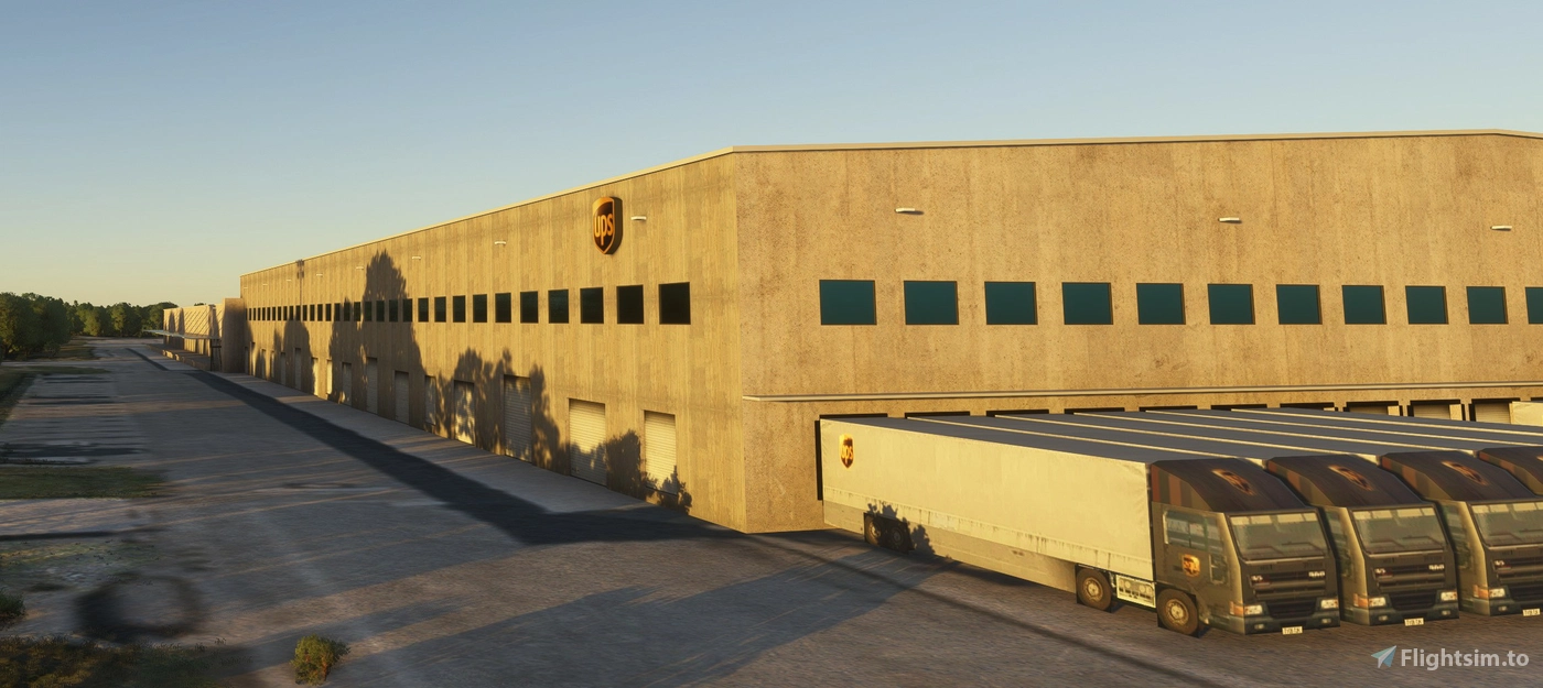All buildings have been custom modeled, including the large UPS facility located across the street from the airport’s main office. The developer used a combination of 3D references from Google Earth, street view, and other online image sources to recreate the airport with attention to layout and structure. The pool area has been enlarged beyond what satellite imagery shows, reflecting changes in land use. Runway 11 has been set as the primary configuration, replacing Runway 29. The developer has opted not to use PBR ground textures due to visual inconsistencies, stating they appeared overly bumpy.