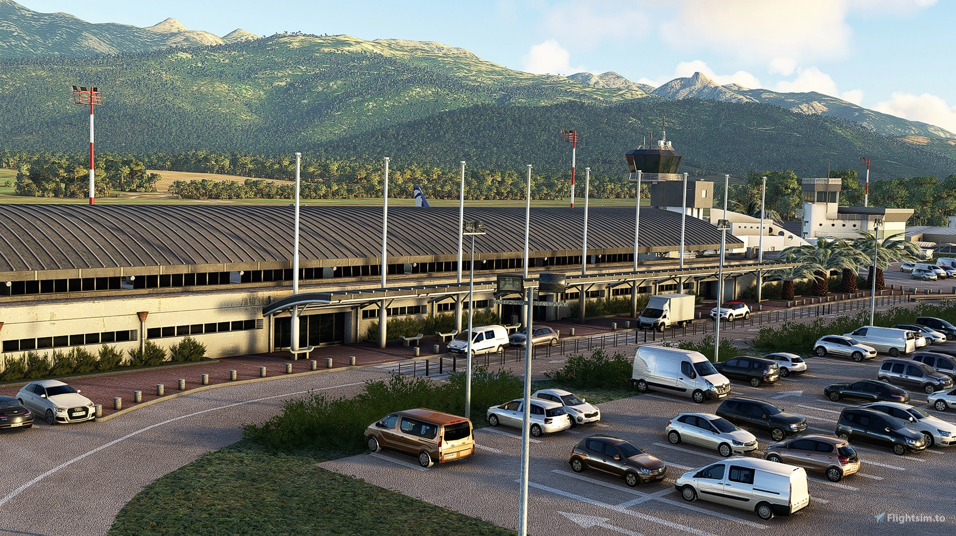 FSX3D has released a detailed rendition of ⭐ LFKF – Figari for Microsoft Flight Simulator 2024, offering an updated representation of the airport environment as of 2023. This scenery features photorealistic terrain for the surrounding region and custom ground textures that reflect the airport’s real-world layout and markings. All major airport buildings have been recreated using high-resolution PBR textures, including the terminal and other infrastructure. The add-on also introduces animated and static elements that contribute to a more immersive experience. This includes a mobile radar tower with movement, a Rosenbauer Panther fire truck that patrols the apron, and a static unit. The apron features an Airbus A320 placed alongside service vehicles, as well as a variety of ultra-low poly European car models. All assets in the scenery are custom-built and do not rely on default Microsoft Flight Simulator elements.