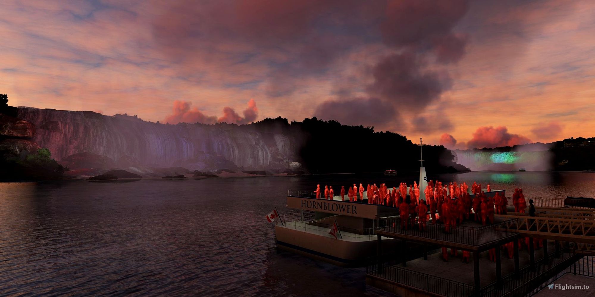 The add-on also includes a custom-built Niagara Helicopters Heliport (CPQ3) with a hand-crafted terminal and interior, along with hangar, hangar interior, and animated doors. There are 13 helipads to choose from at the heliport, which is perfect for those who want to explore the area from the air. In addition to the falls and heliport, the add-on also features custom 3D modeled hotels and casinos of the Niagara Falls City skyline, custom animated rapids and rapid textures along the Niagara River, and custom 3D modeled docks on both the USA and Canadian sides. The docks are complete with crowds of tourists queuing to board, rendered in the correct poncho colors for each tour company.