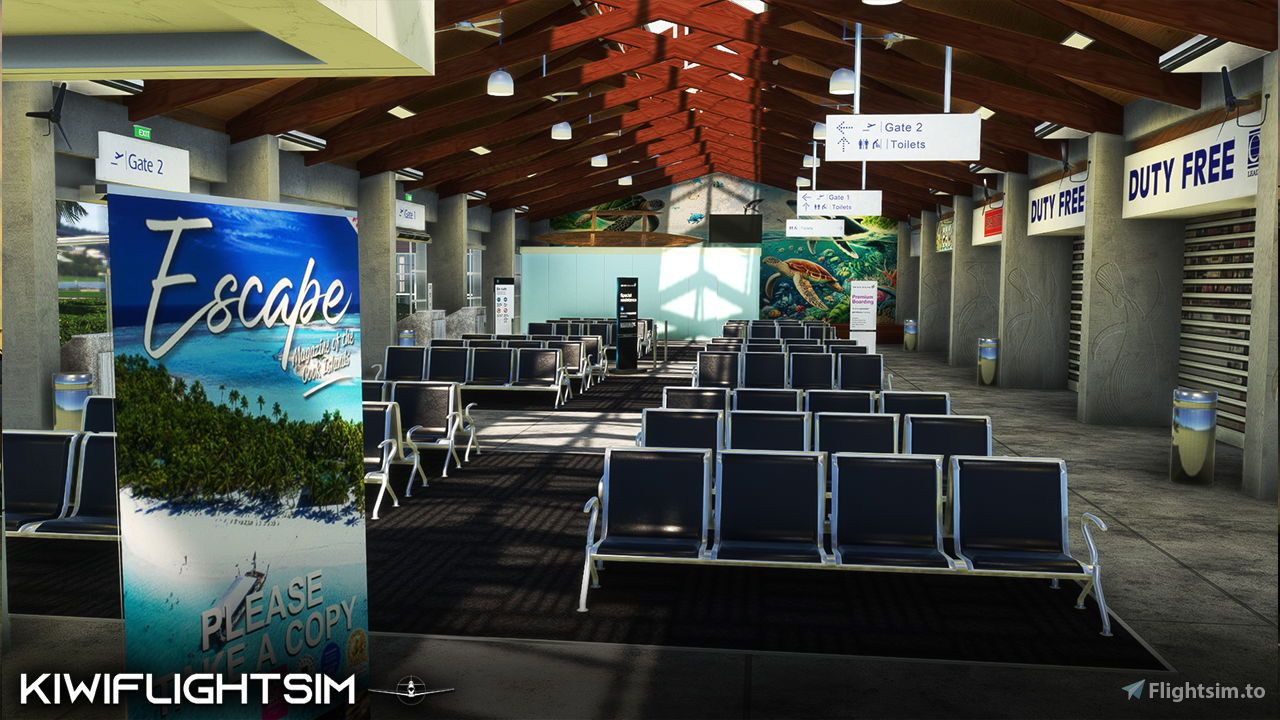 The airport includes accurately modeled airport buildings and custom ground markings. Several interiors have been designed, including the terminal and control tower, with features such as the check-in counters, seating areas, and two vibrant murals that showcase local art. Another mural, the Marae Moana, stands out along the coastal road near the airport. Spanning 500 meters, it celebrates Rarotonga’s natural beauty and rich marine life.
