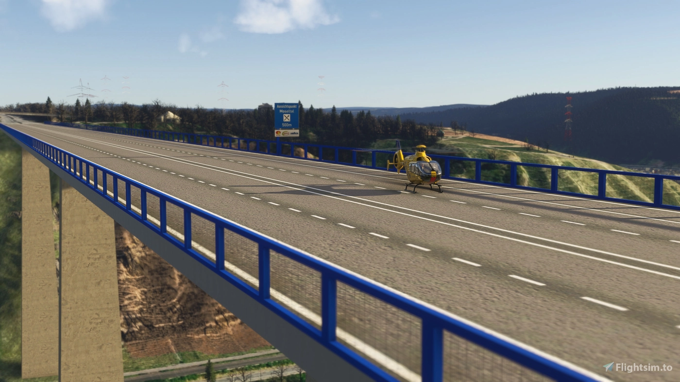 Beyond the airport itself, the scenery extends to include two prominent landmarks: the Moseltalbrücke, the striking bridge that spans the river valley near the field, and the Kühkopf Fernmeldeturm (telecommunications tower), both rendered as handcrafted 3D models. These additions give VFR pilots recognizable reference points that improve situational awareness when navigating the region.