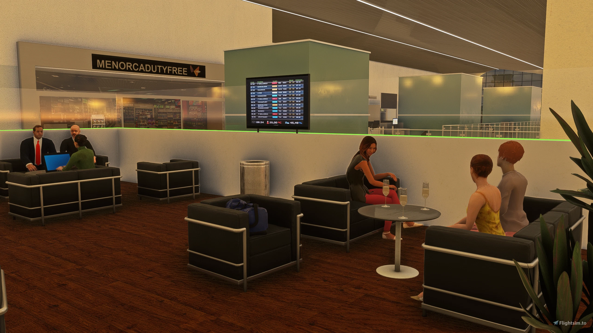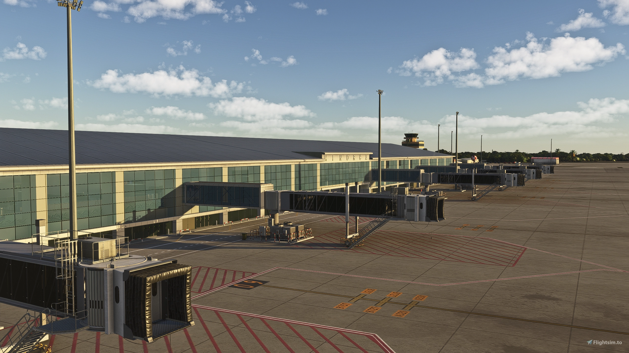 Several custom 3D models have been introduced as part of the scenery package. The airport tower, apron lighting structures, and additional airport buildings have been recreated to replace or improve default simulator assets. The main terminal building is also included as a custom model, and it supports exploration in ego perspective, allowing you to walk inside the terminal area within the simulator.