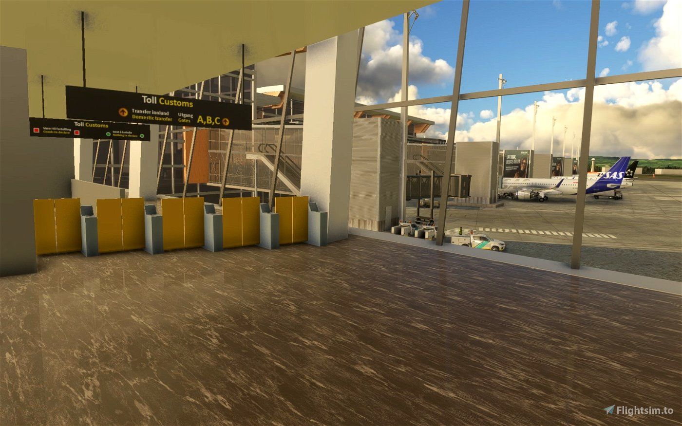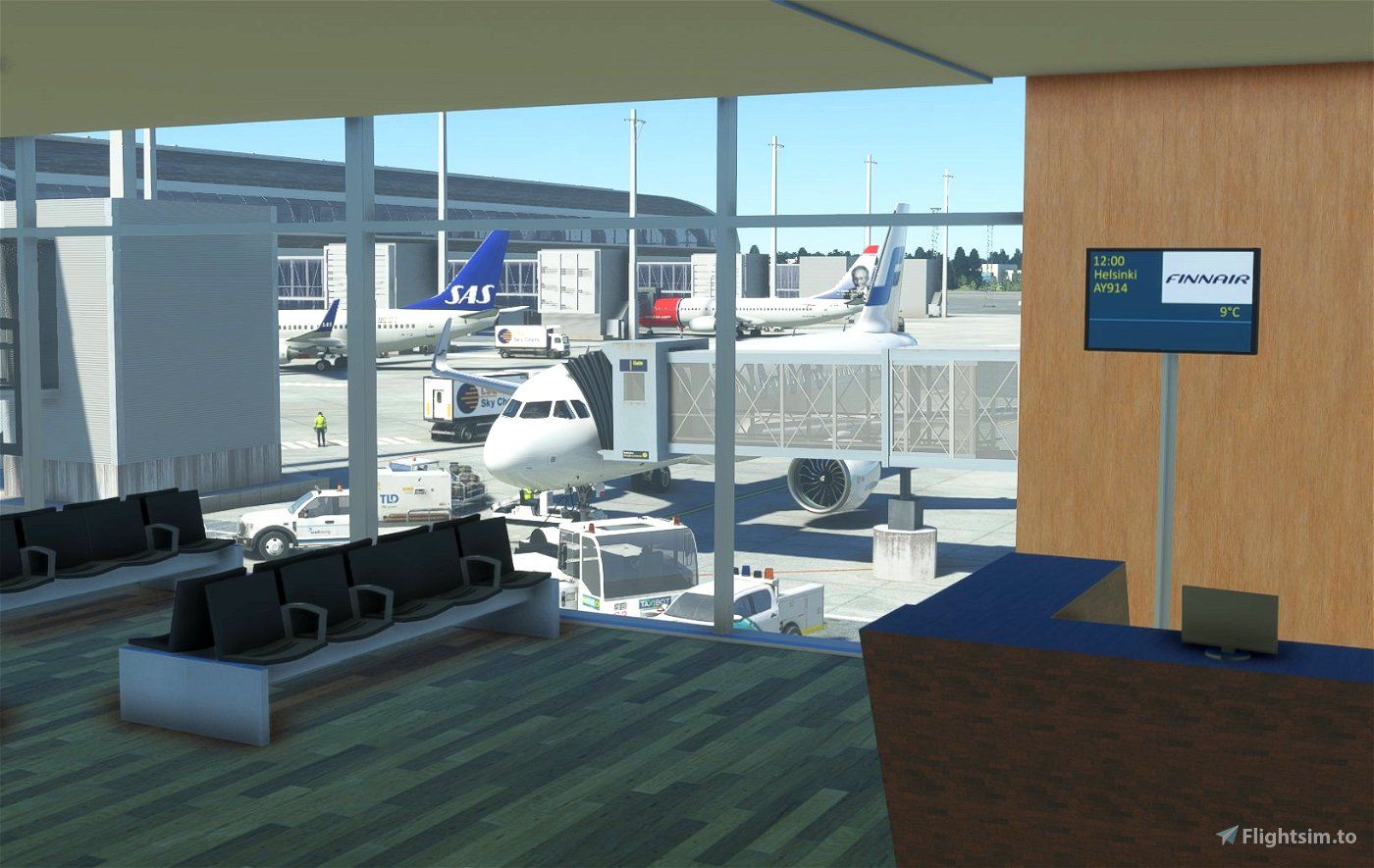 - Custom gate information screens for almost every gate with real life airlines, destinations, flight numbers at gates that could be possible in real life for those flights. Includes airlines such as SAS, Norwegian, Flyr, Widerøe, Finnair, Lufthansa, KLM, British Airways, Emirates, Turkish Airlines, Swiss, TAP, LOT, Icelandair, Air France