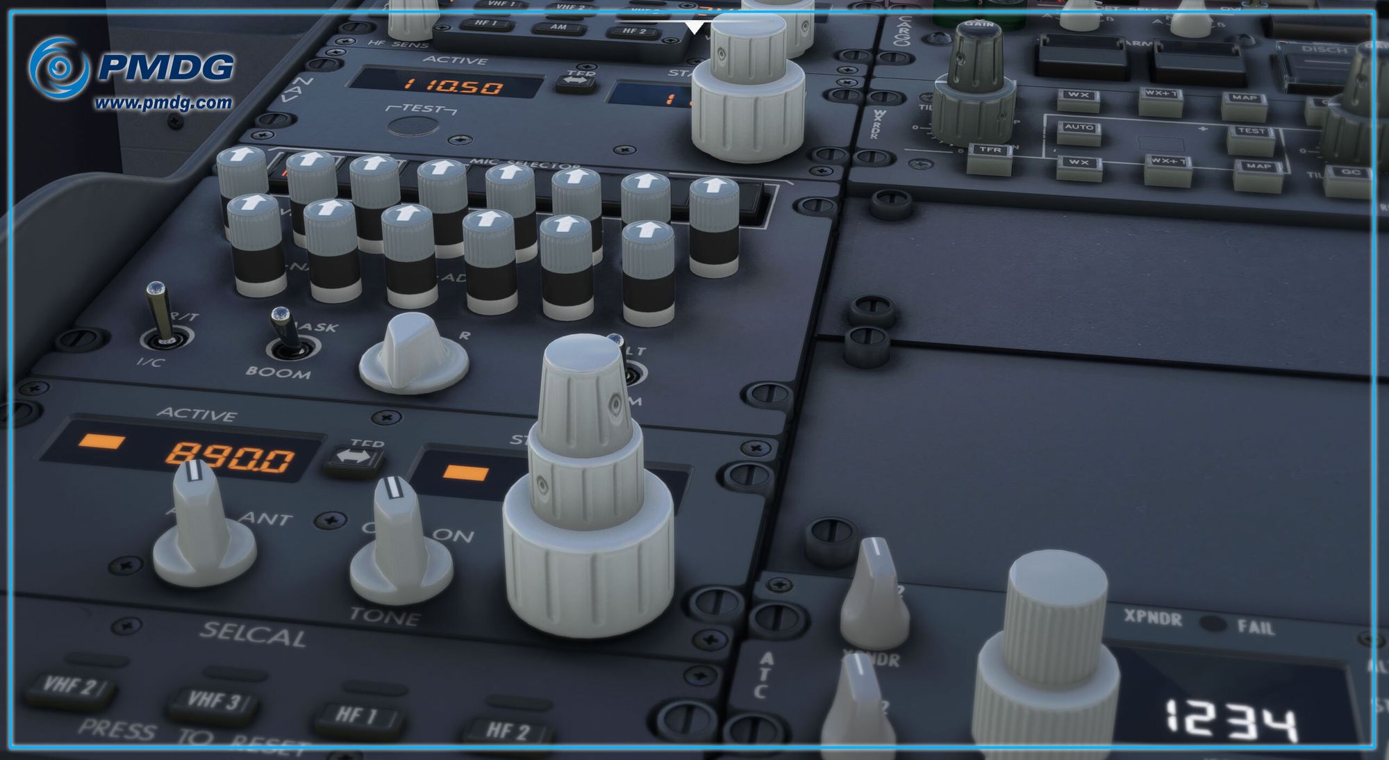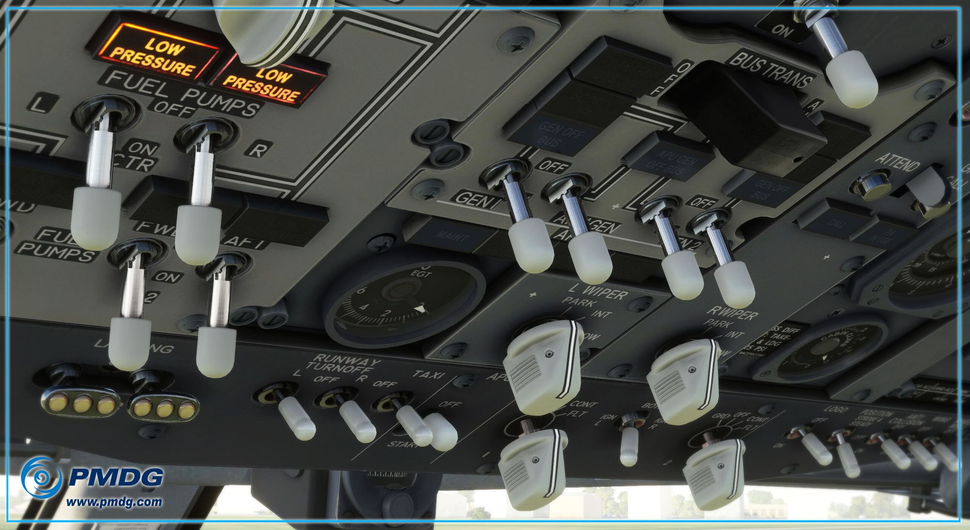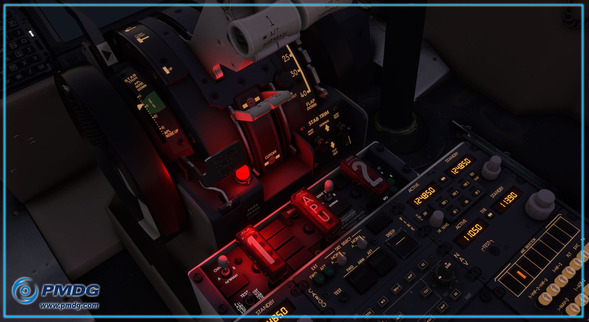 Throughout the cockpit, existing PMDG customers will note a tremendous improvement in the overall model quality and level of detail. The tremendous capabilities of the lighting model in MSFS really allow us to improve the total visual quality of the simulation in a way that simply couldn't be supported on previous platforms. [...] Flood, wash and dome lighting is all fully variable, along with the panel backlighting. The flexible grimes lights and reading lights are also available for your use if you like to add a bit more lighting to your night flying.
