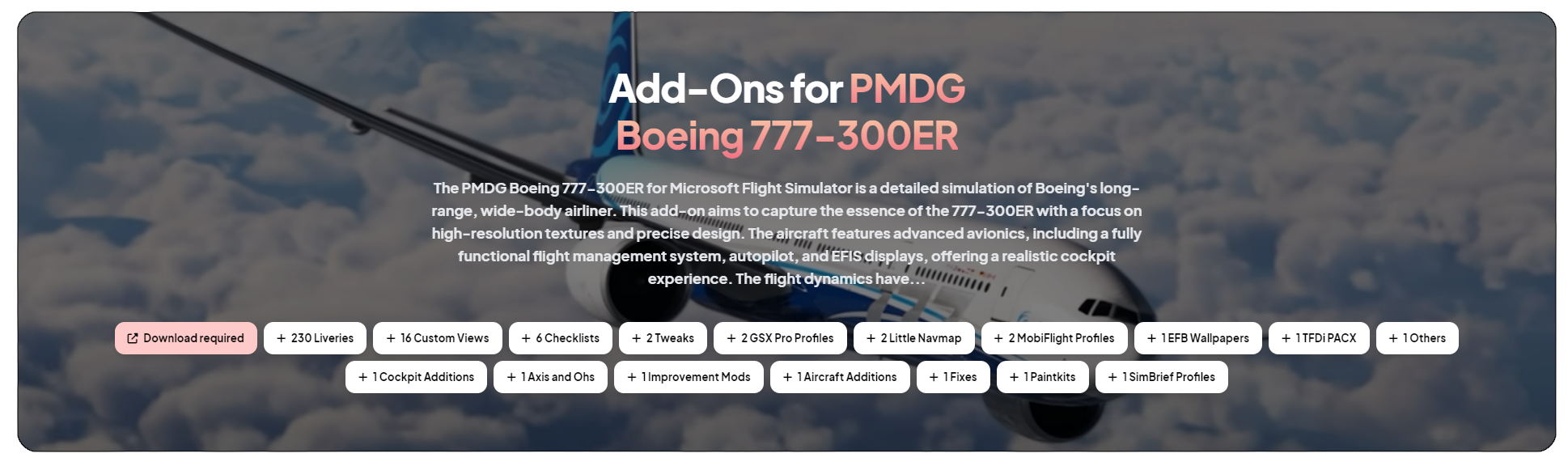 We've highlighted some of the most popular add-ons since the release of the PMDG 777-300ER - but there are many more. Now, it's your turn to enhance your flight simulation experience with these exceptional mods. If you find an add-on particularly enjoyable, consider supporting the creators through donations to encourage continued development. For even more add-ons, visit our dedicated Add-On Overview Page for the PMDG 777-300ER, where you can explore the latest uploads per category. Additionally, you can now add this aircraft to your library of owned products, allowing you to filter your Since Visited and Discover/Search pages for related content specifically. This new feature highlights relevant items with an orange circle next to their category, making it easier to find add-ons specific to your owned base products. Enjoy your enhanced flights!