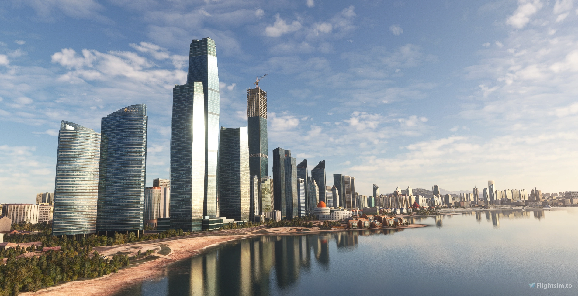 The add-on features a detailed terminal model accompanied by a simplified interior layout. Ground markings are accurately represented, and the airport includes functioning custom jet bridges with animation. The scenery goes beyond the airport itself by incorporating over 300 notable buildings and landmarks from the surrounding Qingdao cityscape, as well as the inclusion of the Jiaodong Bridge.