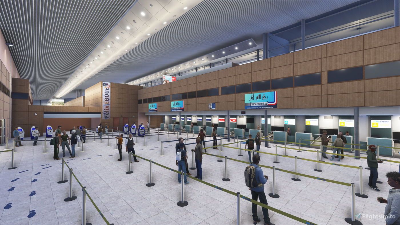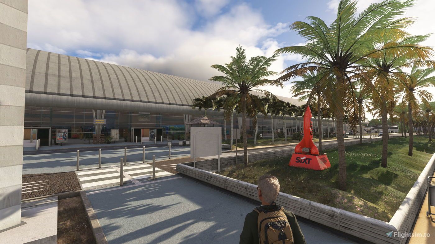 The scenery offers an immersive experience that brings the airport's modern aviation infrastructure and tropical surroundings to life with accuracy. The developers have included several enhancements such as detailed 3D modeling, 4K PBR textures, custom animations, and dynamic lighting. A modeled terminal interior and animated passengers have been included. Ground textures reflect realistic wear and grunge, while custom taxiway signs and corrected terrain elevations complete the package.