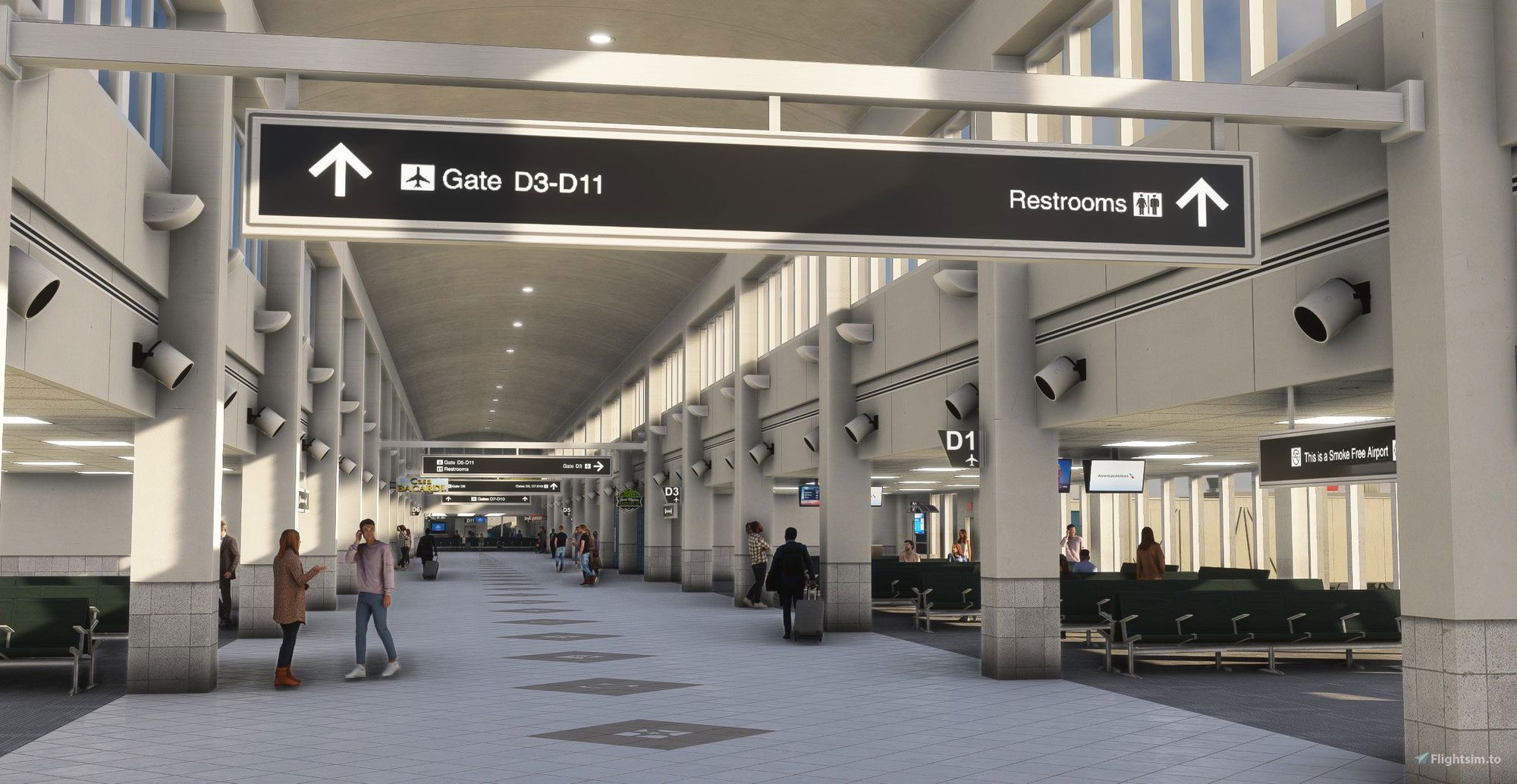 The new release includes an updated 2025 airport layout and models the terminal with a simplified interior to ensure performance. Airport buildings, hangars, and FBOs are fully modeled with accurate textures and PBR materials. The surrounding area, including Skypark, has also been modeled to add context to the airport environment. You will find custom aerial imagery, taxiway signage, and airfield lighting, which aim to reflect the real-world layout.