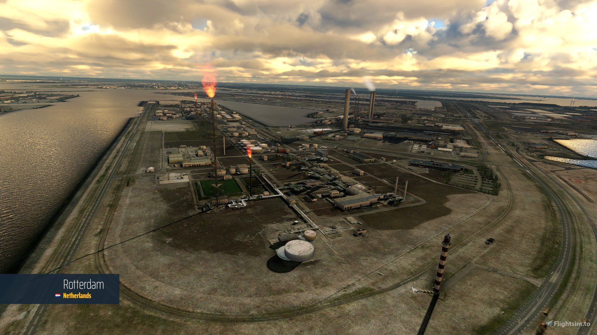 - Hundreds of flare stacks with fire effects